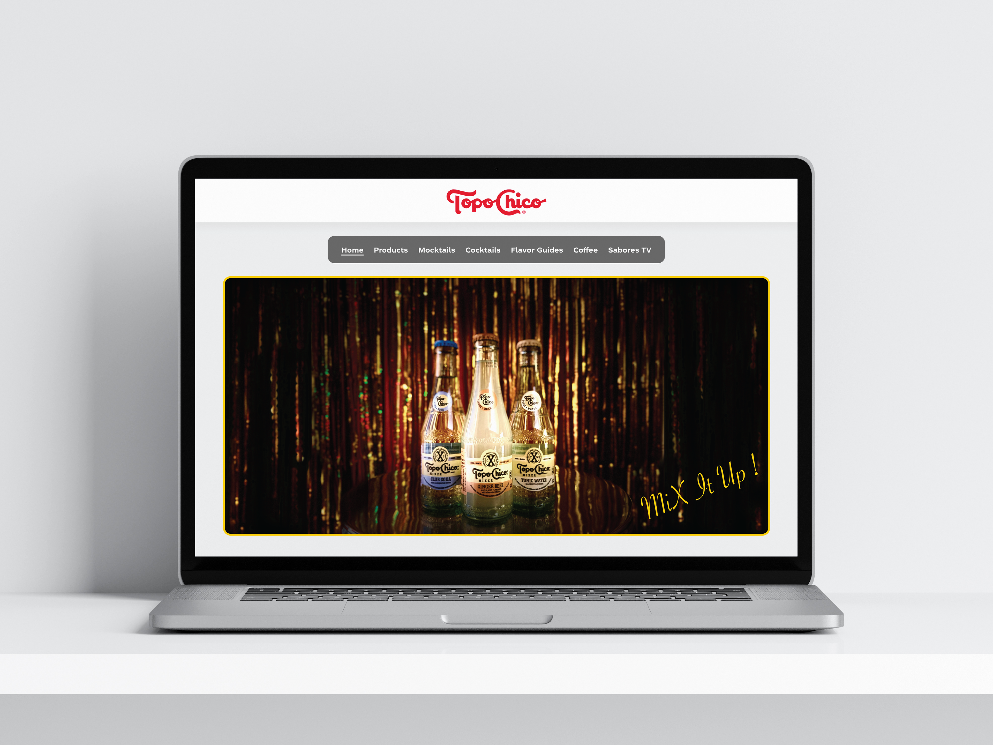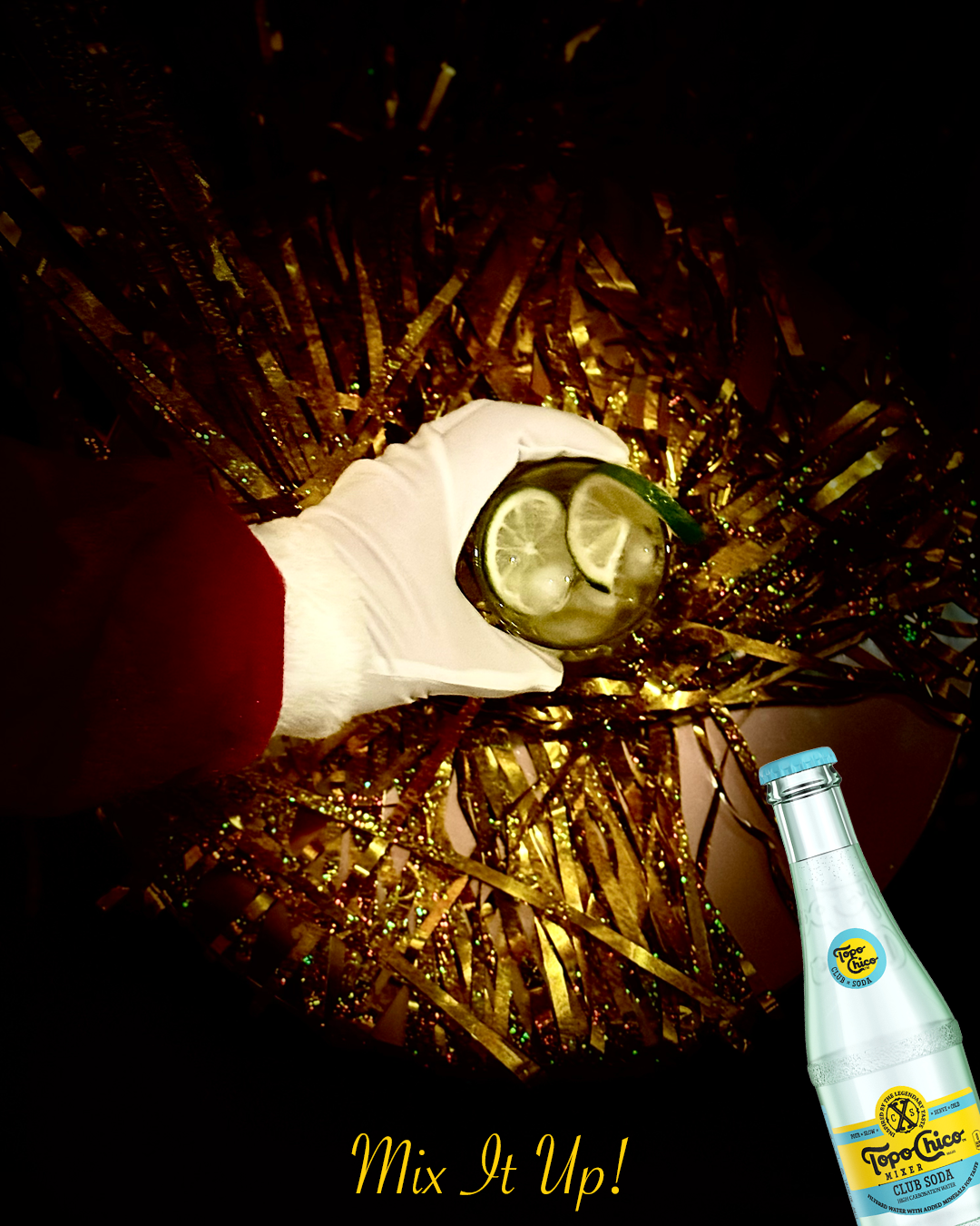 A dynamic campaign replaced the traditional holiday theme with a festive, party-inspired design featuring tinsel and disco balls. The Topo Chico mixer remained the focal point, with only the model’s hand shown to emphasize the product. A warm, colorful visual tone was created using a festive color palette and a playful yet elegant typeface.